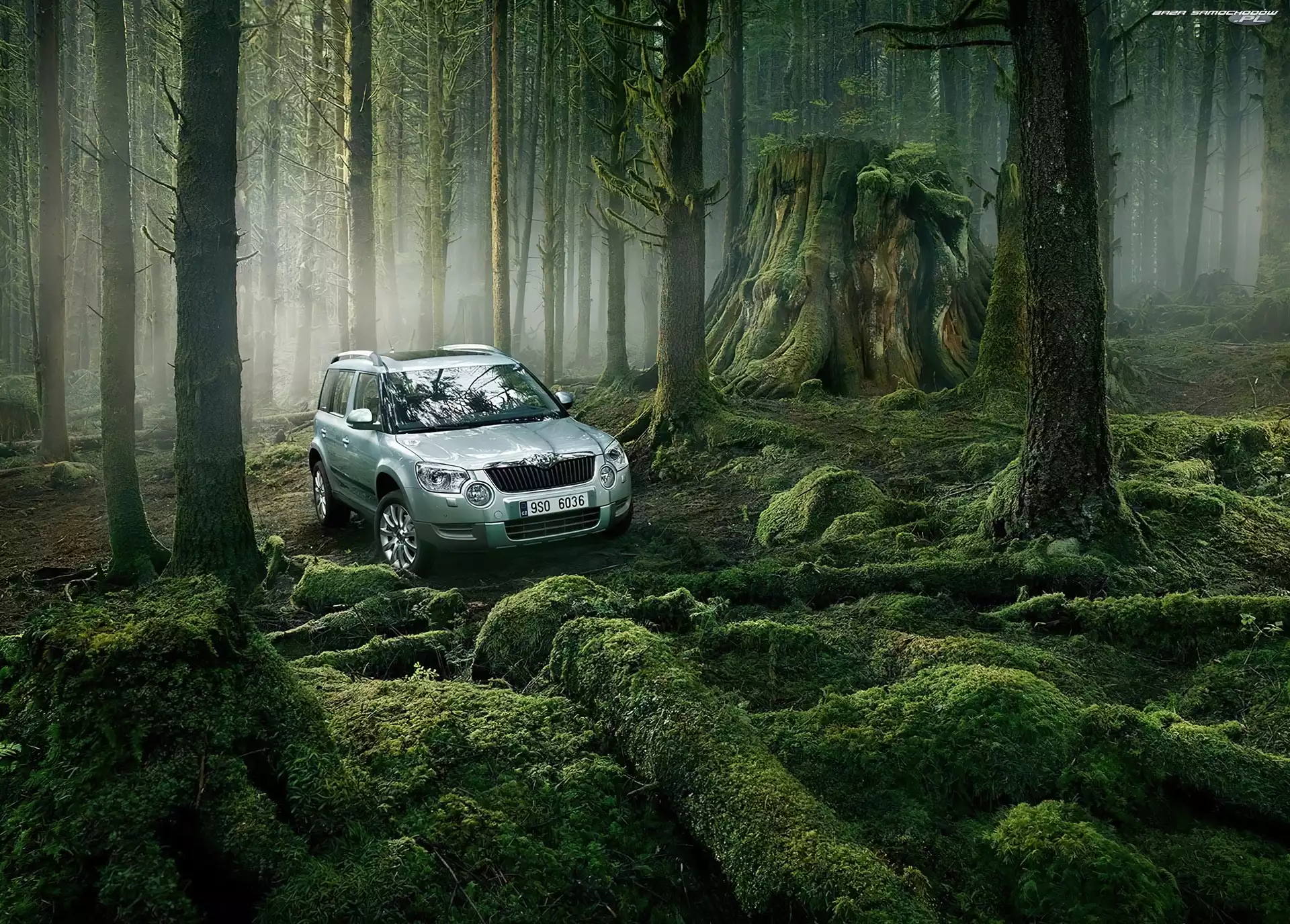 Terenowa, Skoda, Pnie, Las- Zdjęcia samochodów