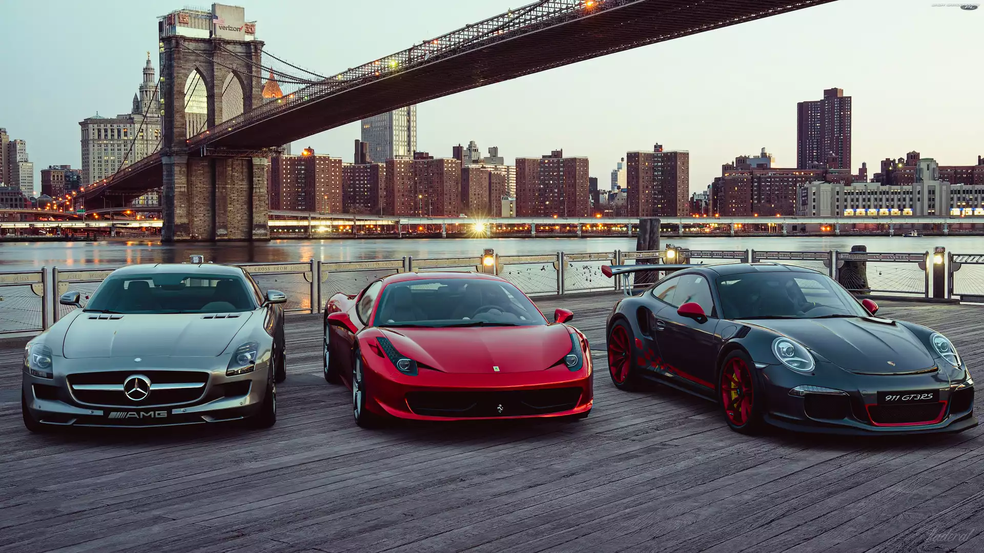 Samochód: Porsche 911 GT3 RS, Trzy, Nowy Jork, Mercedes-AMG SLS, Ferrari, Most Brookliński, Samochody